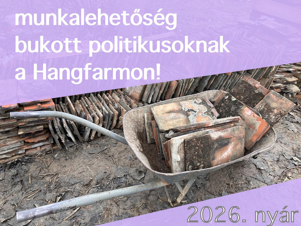 A Hangfarm hangművészeti zöldmező szeretettel és békével várja bukott politikusok jelentkezését nyári, alkalmi munkára. A munkakörök: házfelújítás (vályogozás, pólyás födém építése), kiállítási tárgyak gondozása, kubikolás, budiépítés és -tisztítás, növényzet karbantartása. Szakképzettség nem szükséges. Bármelyik párt bukott politikusainak jelentkezését várjuk, de előnyben részesítjük a Magyarországon bejegyzett pártok bukott tagjait. Az eredeti párthovatartozást nem vesszük figyelembe, emiatt elképzelhető, hogy vegyes brigádokat is kialakítunk, így esetenként kénytelenek lehetnek más gondolkodású munkatársakkal is együttműködni.